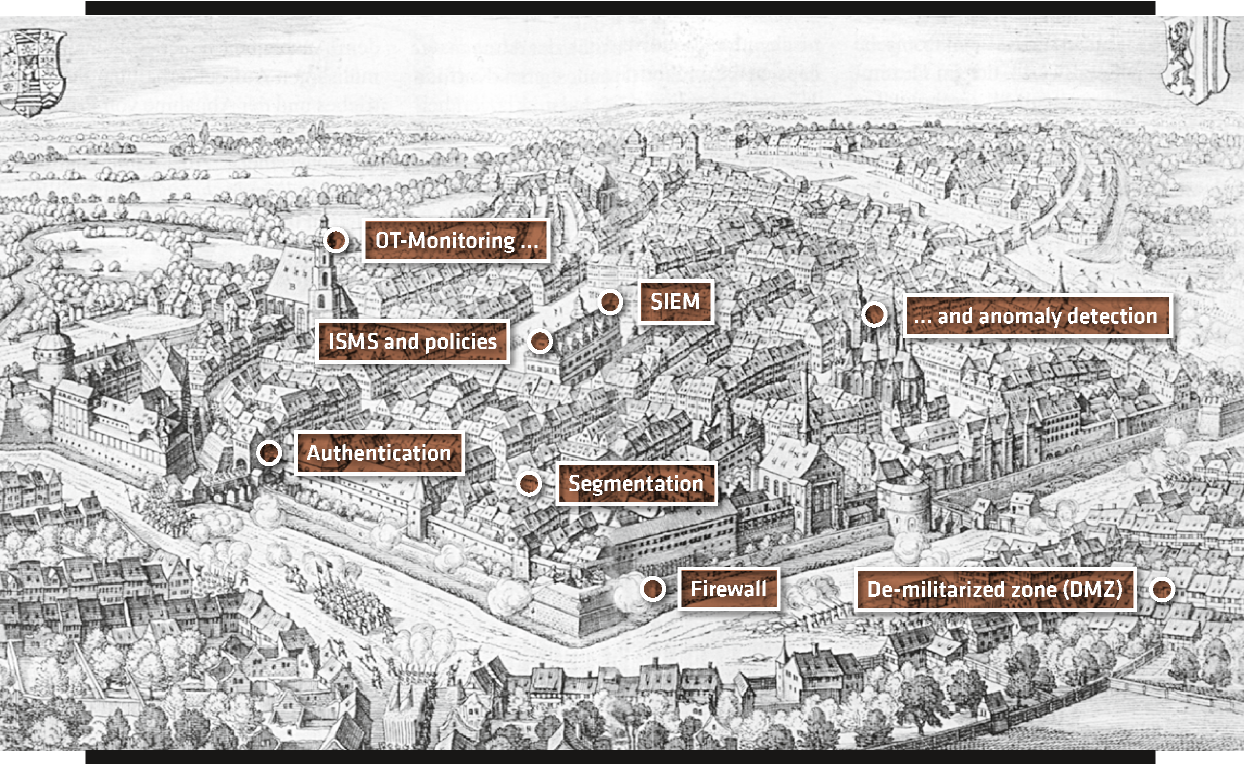 A state-of-the-art, strongly connected network must be secured like a modern city state (to simplify the picture). The city walls, gatekeepers and the military (i.e. firewalls, data diodes and authentification) secure the city against visible, known external threats. The inhabitants follow the mandatory standards and legislation (ISMS, IT and compliance guidelines). The police and the organs of the Federal Office for the Protection of the Constituition are responsible for domestic, i.e. internal security within the country or city. Currently, most energy suppliers only secure the borders of their OT and ICS. Few industrial networks have mechanisms in place for ensuring internal / homeland security.